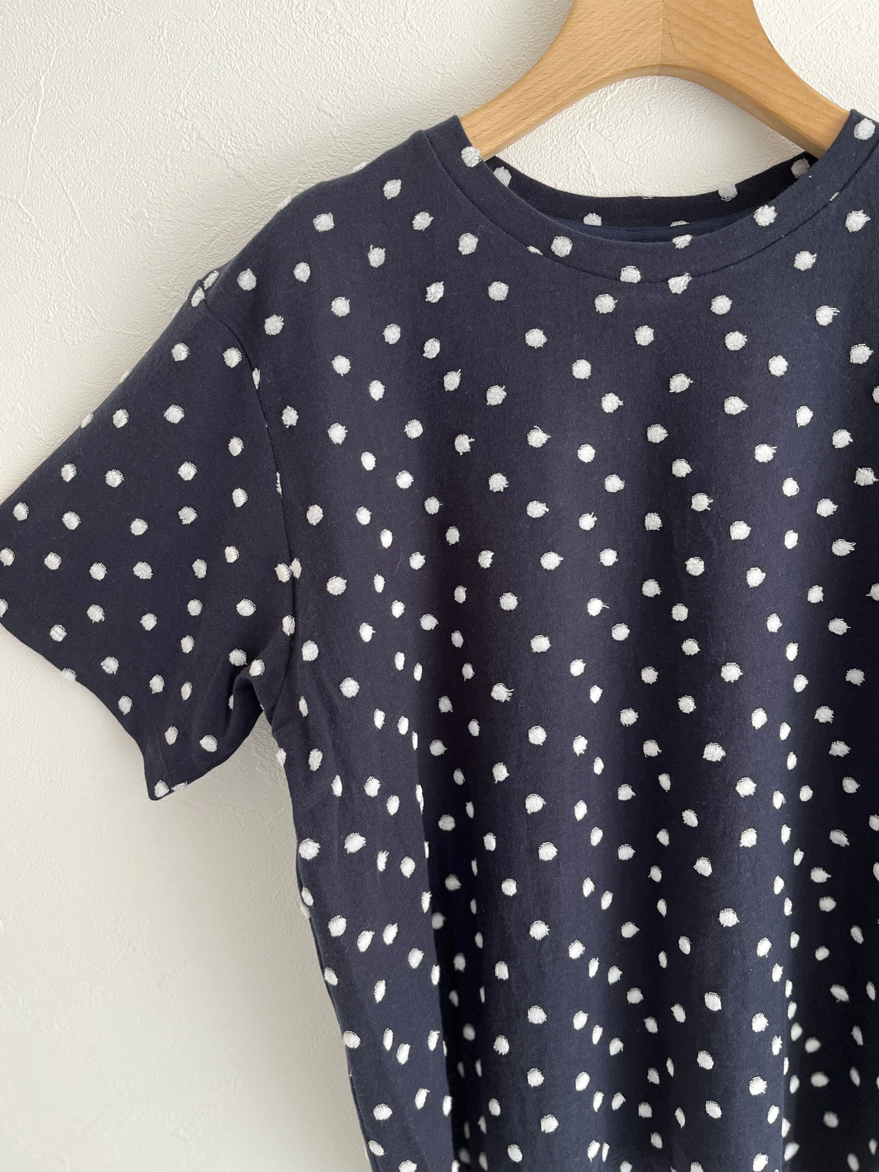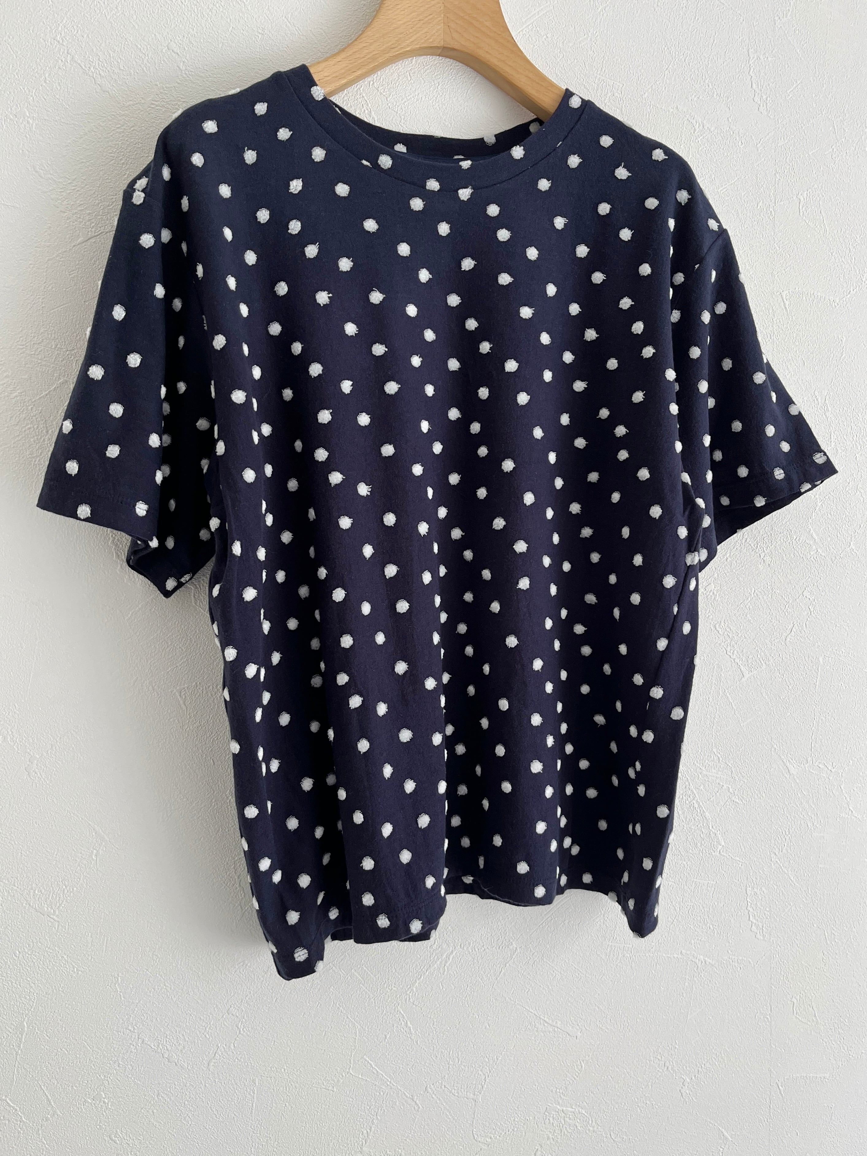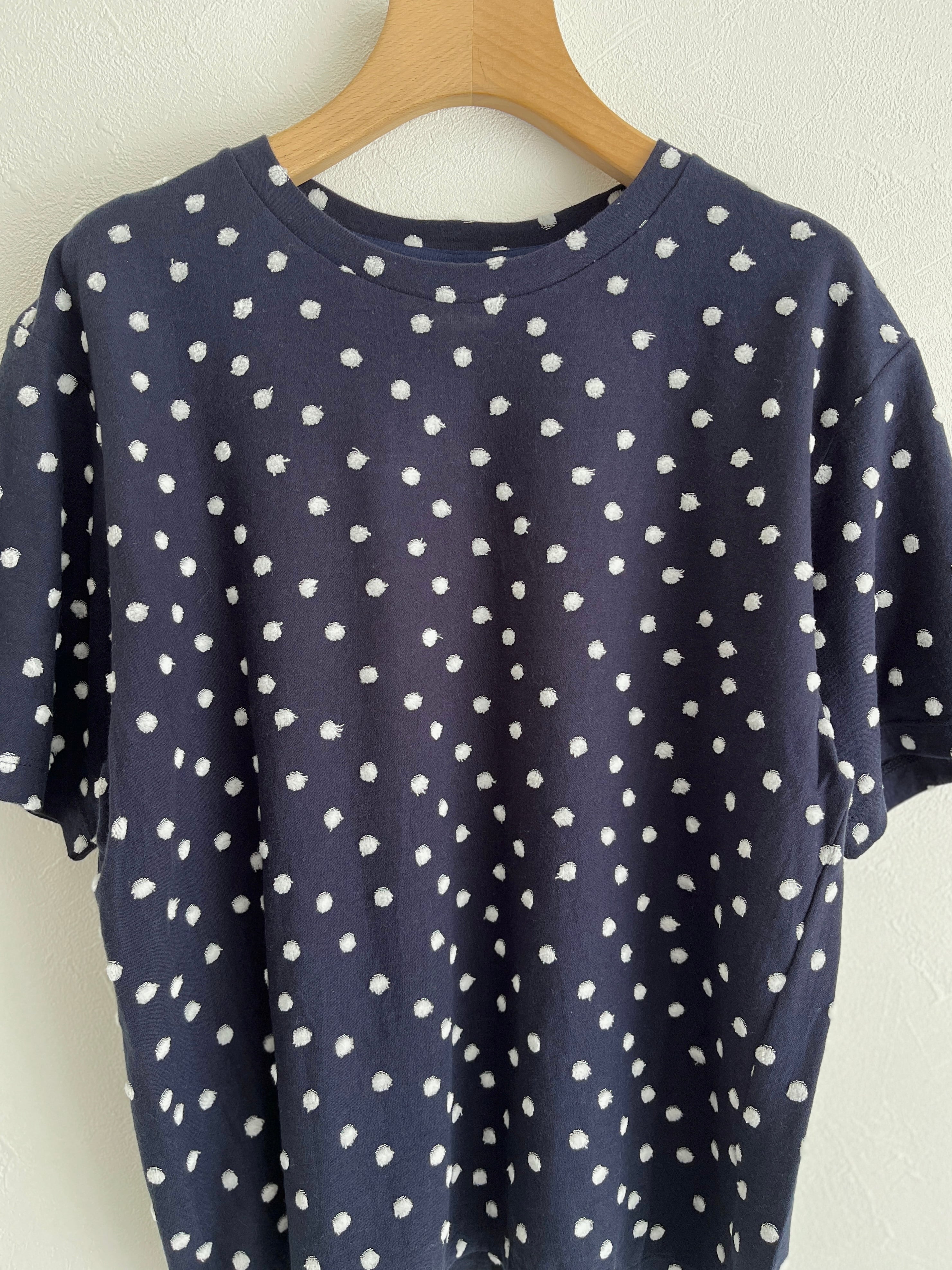 ジャカードのパイル機で編んだ先染めの水玉をシャーリングし、水玉の部分をベロア調に仕上げた生地で、カジュアルすぎずに1枚で着られるTシャツ。