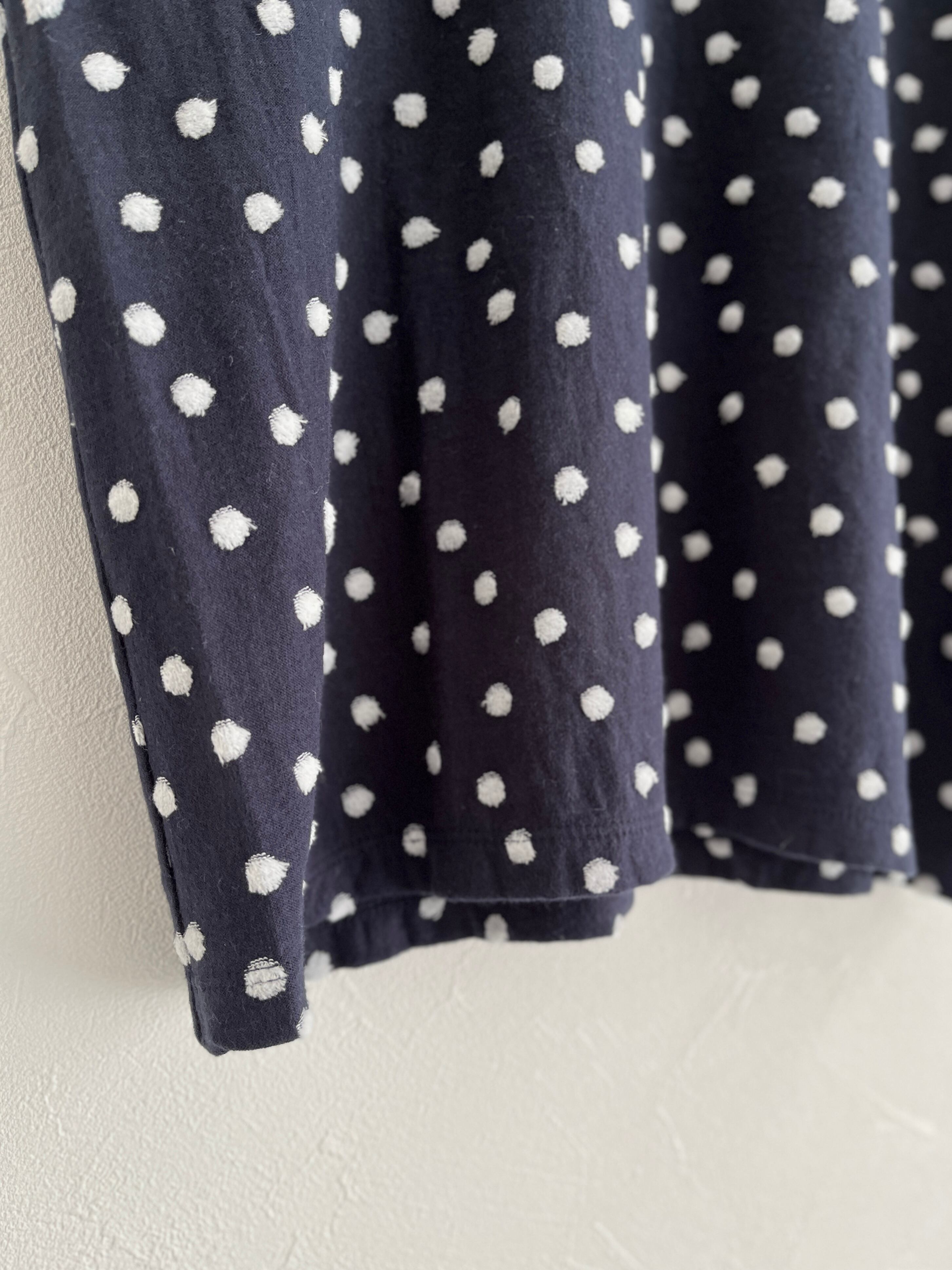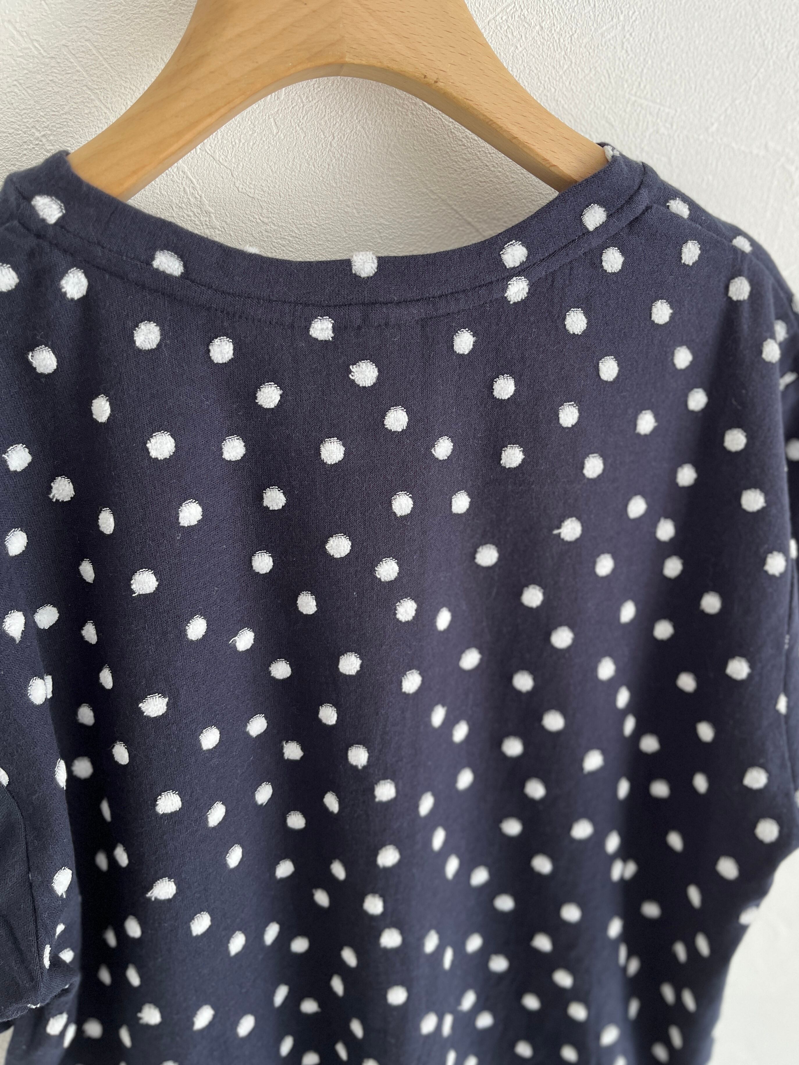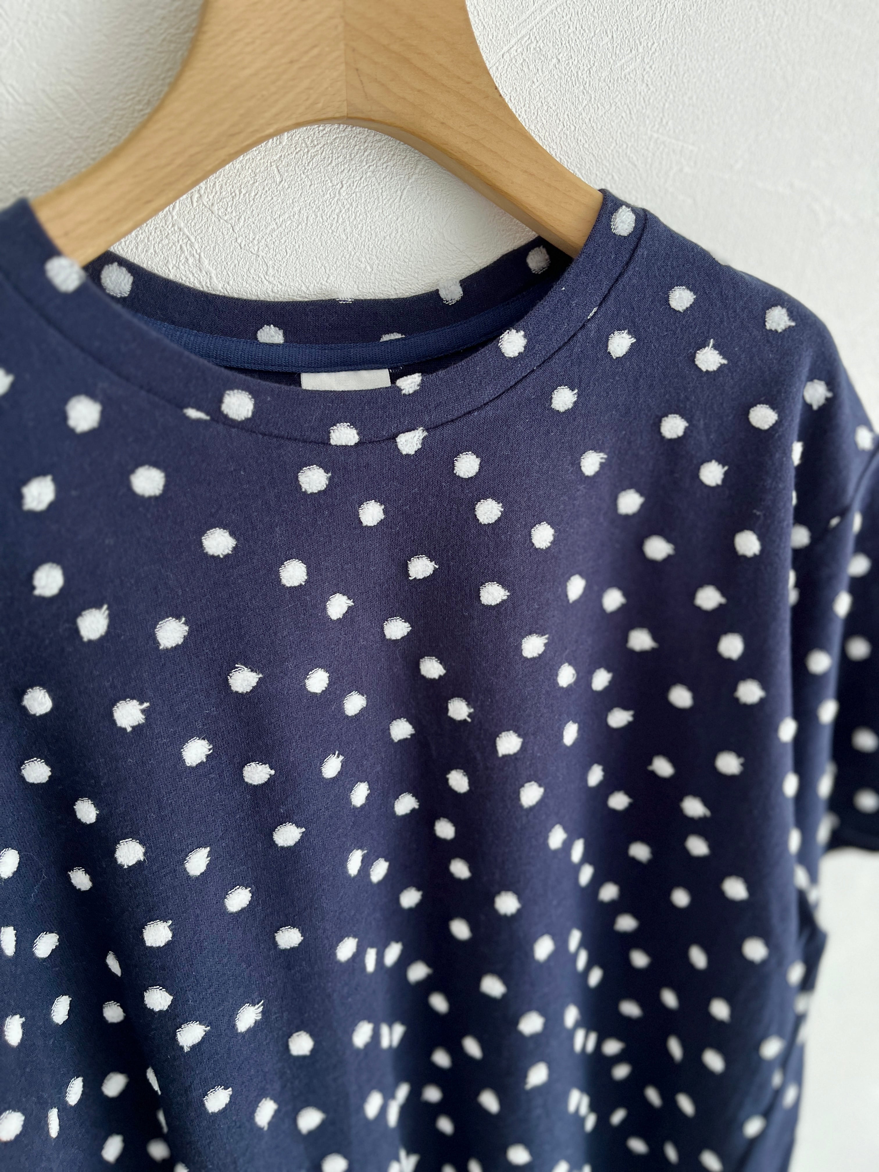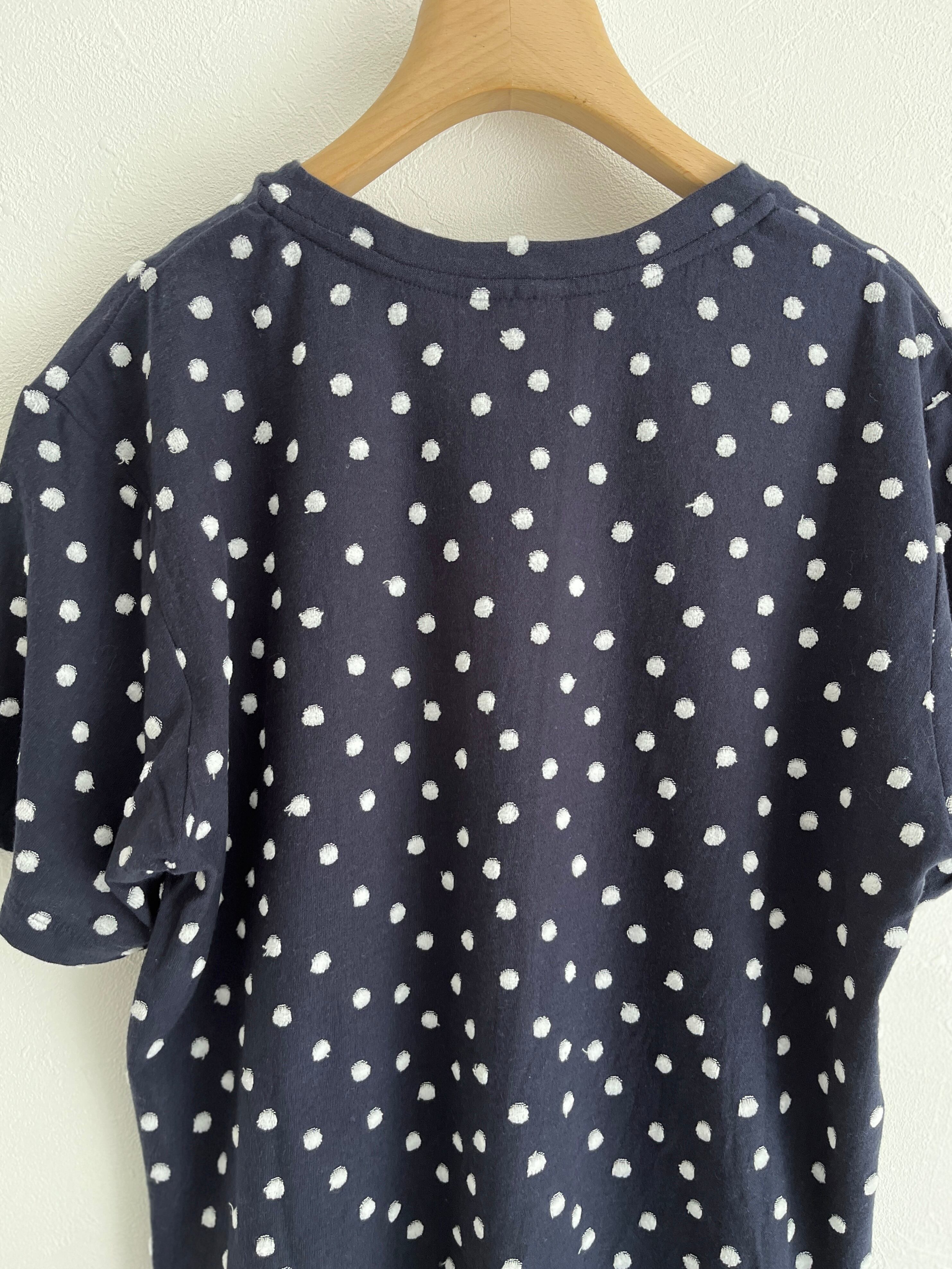 ジャカードのパイル機で編んだ先染めの水玉をシャーリングし、水玉の部分をベロア調に仕上げた生地で、カジュアルすぎずに1枚で着られるTシャツ。
